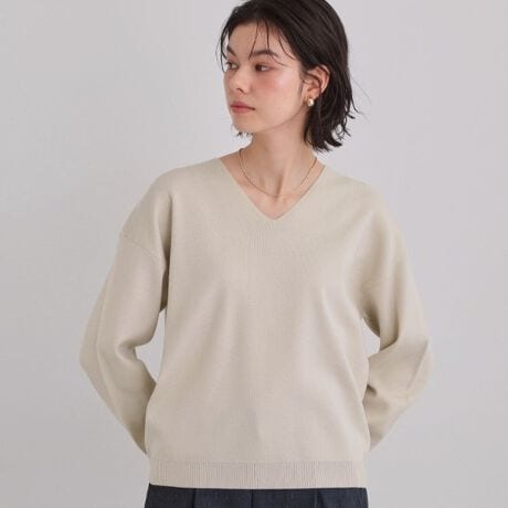 シャープなネックラインが顔周りをすっきり見せ、体の線を拾いすぎない端正シルエットで上品に。