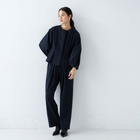 ・なめらかで落ち感のあるダブルクロスのような素材。きれいめながらもラクでイージーな着心地。