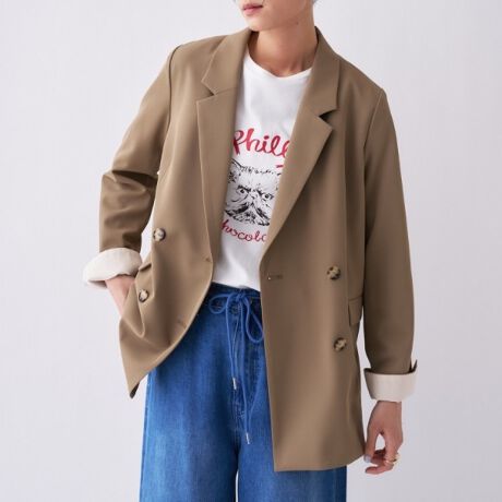 ・すっきりとした襟デザインとダブルボタンがマニッシュな雰囲気を演出し、オンオフ問わず活躍する一着です。
