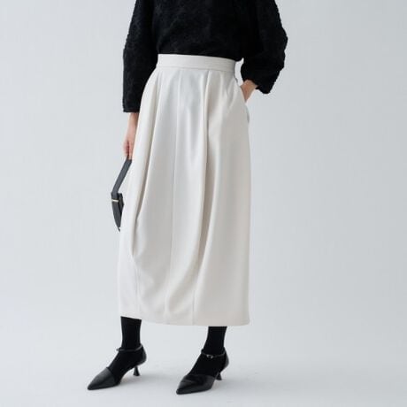 ・腰周りに丸みを持たせ、裾に向かって緩やかにすぼまるコクーンシルエットが大人の雰囲気を演出するロングスカート。