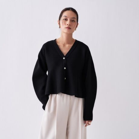 ・裾に向かってふんわりと広がるペプラムシルエットが、トレンド感と女性らしさを引き立てるニットカーディガン。
