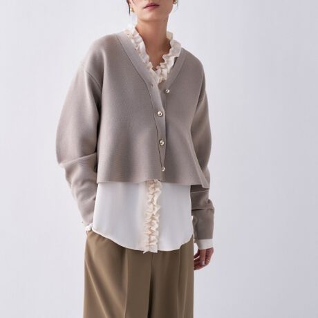 ・すっきりとしたVネックがデコルテを綺麗に見せ、ボタンを閉じてプルオーバーとしても、羽織りとしても使える2WAY仕様。