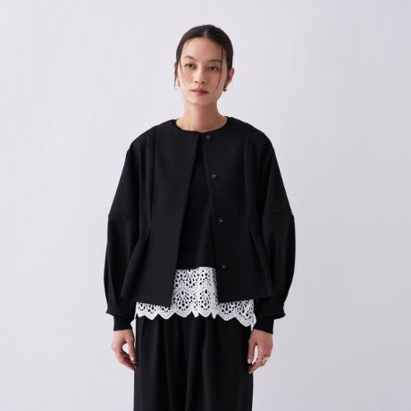 ・カーディガン感覚で気軽に羽織れる、ショート丈のノーカラーブルゾン。