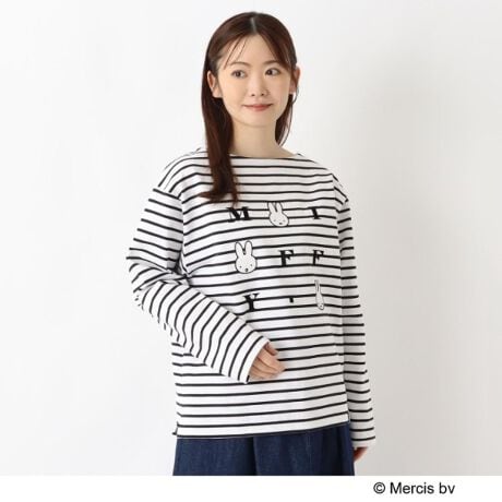 [型番:41015732]【デザイン】厚手の天竺の素材でミッフィーのかわいいボートネックのバスクシャツです。フロントにはミッフィーのイラストとロゴ、裾にはミッフィーデザインの織ネームが付いています。※照明の関係により、実際よりも色味が違って見える場合があります。また、パソコン・スマートフォンなどの環境により、若干製品と画像のカラーが異なる場合もございます。
