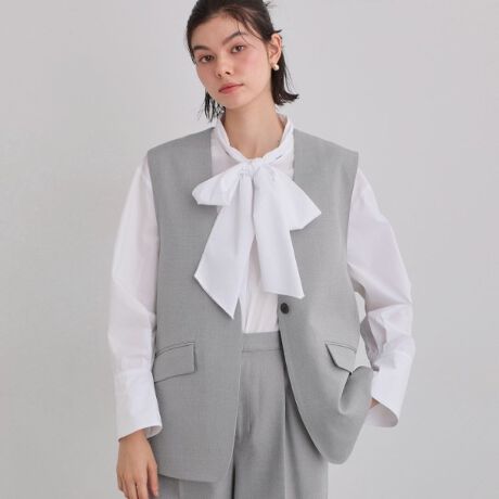 シャークスキンの1ボタンジレ。腰回りを自然にカバーする丈で、縦を強調したすっきりシルエット。