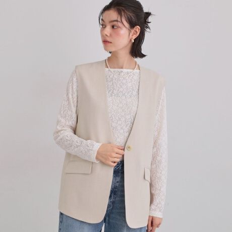 シャークスキンの1ボタンジレ。腰回りを自然にカバーする丈で、縦を強調したすっきりシルエット。
