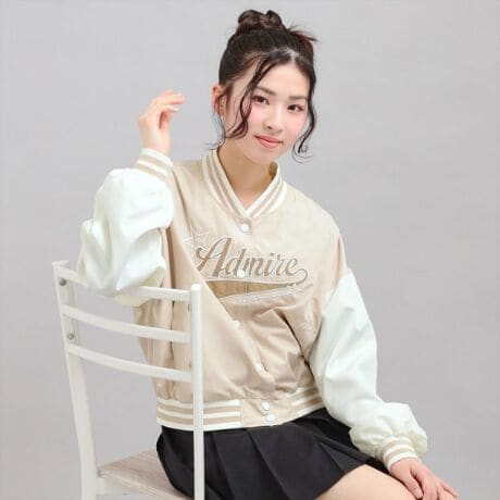 スタジャンはスポーティなアイテムですが、スカートなどガーリーなスタイリングに合わせるのがピンクラテ流!