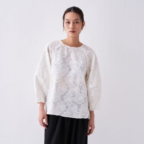 ・毛足のあるふわふわとしたフラワージャカード素材がトレンド感あふれるシアーブラウス。