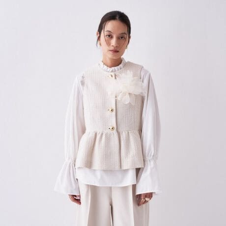 ・華やかなツイード素材とウエストから広がるペプラムシルエットが女性らしいツイードジレ。