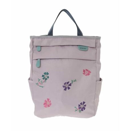 [型番:GG5CD30140]毎回大人気のトートリュックにフラワー刺繍を施したデザインが登場。A4サイズがすっぽりと収まるサイズ感で、トートバッグとしてもお使いいただける便利な2WAY仕様です。両サイドのポケットには傘やボトルなどが収納でき、脇のファスナーから中の荷物を取り出せるのも嬉しいポイント。ストラップや持ち手の配色テープ、裏地のフラワー柄のテキスタイルなども加えてホコモモラらしさがぎゅっと詰まったおすすめのひと品です。