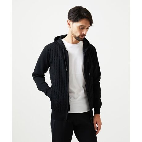 ・身頃は立体感ある編地を12Gで編み上げ、袖はクリーンなハーフミラノ14 Gをドッキング。