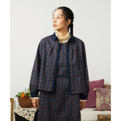 贅沢に刺繍を施した柄が主役のブラウス。セットインスリーブできちんとした印象ながらも、身幅にゆとりを持たせたリラクシーなシルエットです。騎士の盾をイメージしたような幾何調の模様を全面に施した総柄刺繍がデザインポイント。多色の刺繍糸を使用したホコモモラらしいひと品です。小さめの丸襟は女性らしい雰囲気を後押し。前開きのシャツタイプで羽織としての着用も可能で、同色系の無地生地で切り替えたところにも注目。