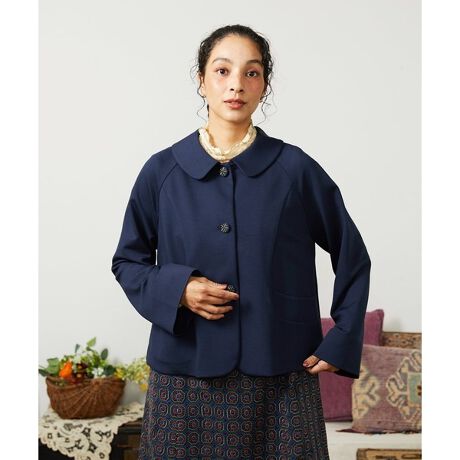 きちん見えと楽な着心地を兼ね備えたジャケット。シンプルながらもほどよいハリのある素材で上品な印象に。大きめなフラットカラーや刺繍入りのくるみボタンが女性らしい雰囲気を後押しします。ラグランスリーブとゆったりした身幅のデザインで、袖が通しやすくインナーとの重ね着もしやすいシルエットに。通勤や特別な日のお出かけはもちろん、入学式・卒業式のセレモニーシーンなどフォーマルな場にもオススメです。