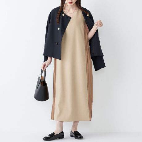 同系色のプリーツなので、大人の落ち着いた印象を与えつつ、動きのあるシルエットでシンプルながら着映えするデザインです。