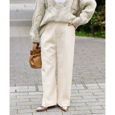 上品な表面感のTR素材に、裏側に滑らかなショートファーをボンディングした、見た目にも着心地にもこだわった一枚。前ウエストはすっきり見えるフェイク開き仕様で、脇ファスナー&後ろゴムにより、きちんと見えしつつ快適な穿き心地に仕上げています。フロントのセンターに施したつまみコバステッチが、縦のラインを強調し、きちんと感とスタイルアップ効果をプラス。シンプルなストレートシルエットで、オンオフ問わず幅広いシーンに活躍します。