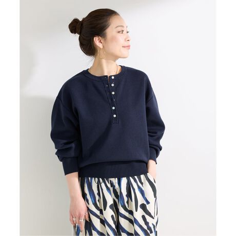 釦開きヘンリーネックの抜け感のあるシルエットの毛羽感を抑えた綺麗目なニットです。ロングシーズン活躍するほどよい肉感とチクチクを感じない素材感が魅力。釦を開けて、中からカットソーを見せたレイヤードスタイルもおすすめです。
