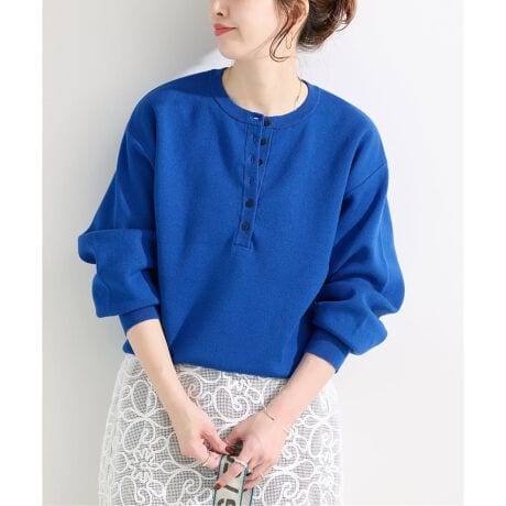 釦開きヘンリーネックの抜け感のあるシルエットの毛羽感を抑えた綺麗目なニットです。ロングシーズン活躍するほどよい肉感とチクチクを感じない素材感が魅力。釦を開けて、中からカットソーを見せたレイヤードスタイルもおすすめです。