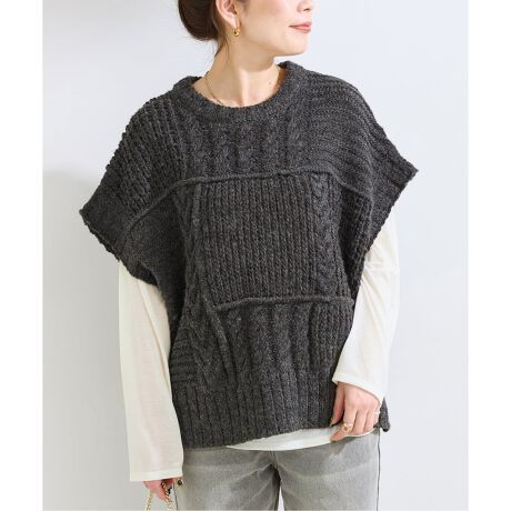 色々な編み目のパッチワーク風の雰囲気あるベストは、身幅にたっぷりとゆとりを持たせ、リラックス感のあるシルエットにしています。シアーのカットソーとレイヤードすることで軽やかな印象になり、また、インナーをシャツなどに替えて色々な着こなしをお楽しみいただけます。