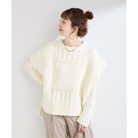 色々な編み目のパッチワーク風の雰囲気あるベストは、身幅にたっぷりとゆとりを持たせ、リラックス感のあるシルエットにしています。シアーのカットソーとレイヤードすることで軽やかな印象になり、また、インナーをシャツなどに替えて色々な着こなしをお楽しみいただけます。