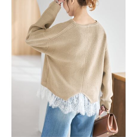 しっかりとした肉感のニットと、裾の透け感あるレースのコントラストが、レイヤードスタイルにさりげない華やかさをプラスします。