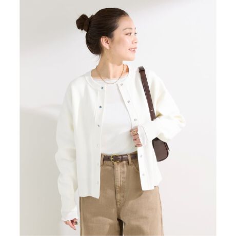 スナップ釦が映えるシンプルなノーカラーシルエットの毛羽感を抑えた綺麗目なニットです。ロングシーズン活躍するほどよい肉感とチクチクを感じない素材感が魅力。ボトムとバランスよく着られるすっきりとした丈感になっています。
