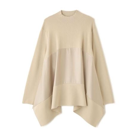 サテンを大胆にきりかえた合繊のニット。