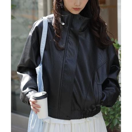 ビンテージのような色ムラとシボ感のある合皮素材を使用したブルゾン。リアルレザーに近い肉感があるしっかりとした生地を使用しています。身幅はゆったりとしたサイズで、裾のゴムを絞るとギャザーが寄って丸みのあるシルエットに。アームホールも広めなので、オーバーサイズのトップスも羽織りやすいです。スタンドネックが今年らしく、前を開けて着るとこなれ感がでておすすめ。ルーズなシルエットのパンツ、ショートパンツ、プリーツスカートともバランスが取りやすいデザインです。※モデルの着用画像の場合、光の当たり具合により、実際の色味と異なって見えることがございます。色味は、商品単体の画像をご参照ください。
