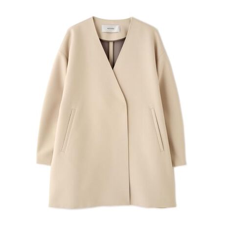 同じ生地を2枚配色で貼り合わせたボンディング素材で仕上げられたノーカラーコートです。