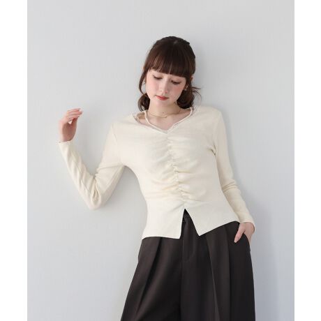 フロントに施されたギャザーデザインが、女性らしい立体感のあるシルエットを演出するリブニット。