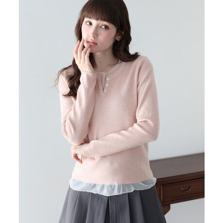 襟元から覗くシアー素材と、裾のフリルデザインが、ヘンリーネックに女性らしい甘さをプラスします。