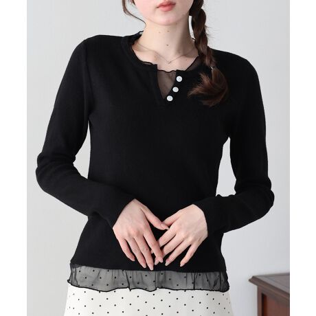 襟元から覗くシアー素材と、裾のフリルデザインが、ヘンリーネックに女性らしい甘さをプラスします。