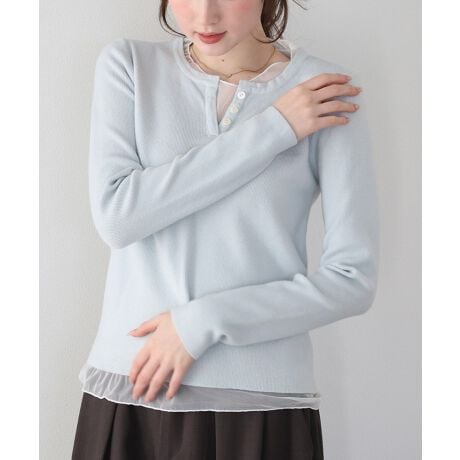 カジュアルな印象のヘンリーネックに、程よい透け感のシアー素材をドッキングしたトレンド感溢れるニット。