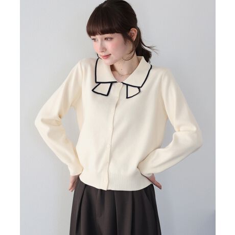 リボンのようなデザインの襟元がかわいらしいニットトップス。