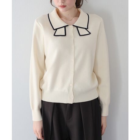 リボンのようなデザインの襟元がかわいらしいニットトップス。