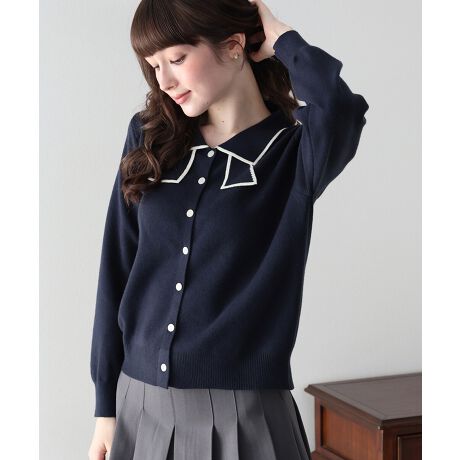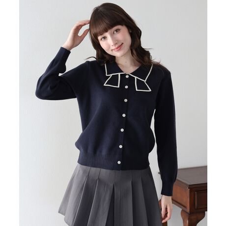 リボンのようなデザインの襟元がかわいらしいニットトップス。