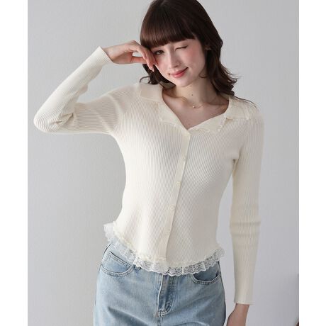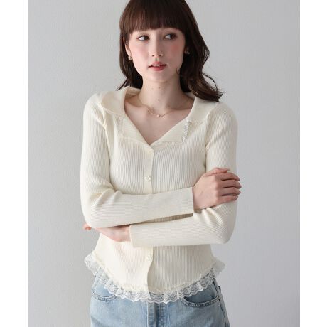 襟元と裾に繊細なレースフリルをあしらった、トレンド感溢れるリブニットトップス。