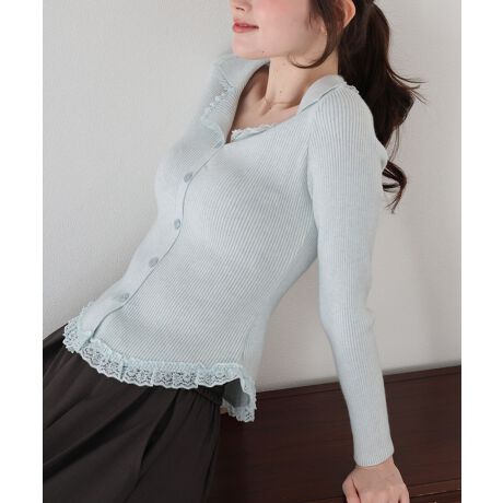 襟元と裾に繊細なレースフリルをあしらった、トレンド感溢れるリブニットトップス。