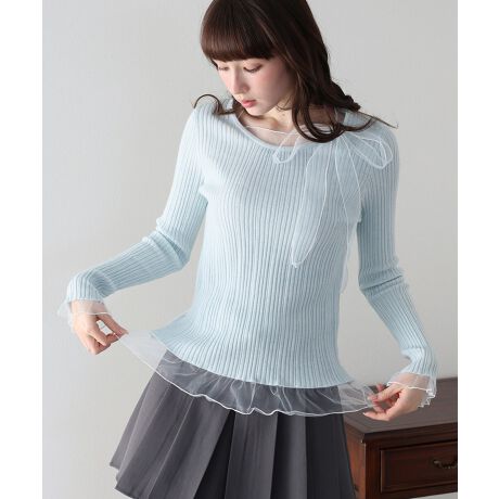 身頃のリブニットに、透け感のあるシアー素材を贅沢にドッキングしたトレンド感溢れるトップス。
