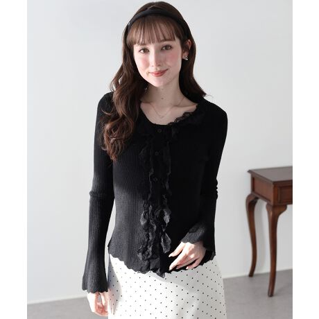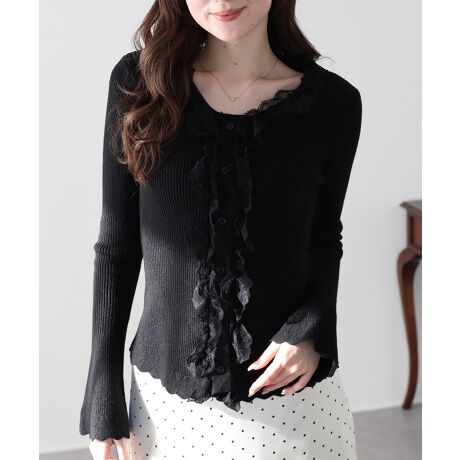 ネックラインから前立てにかけて施されたレースフリルが目を惹く、トレンド感溢れるリブニットトップス。