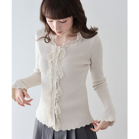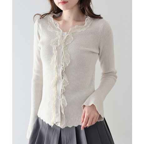 ネックラインから前立てにかけて施されたレースフリルが目を惹く、トレンド感溢れるリブニットトップス。