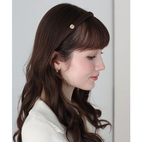 高級感のあるサテン生地のカチューシャにメタルモチーフをあしらい、こなれた印象に。