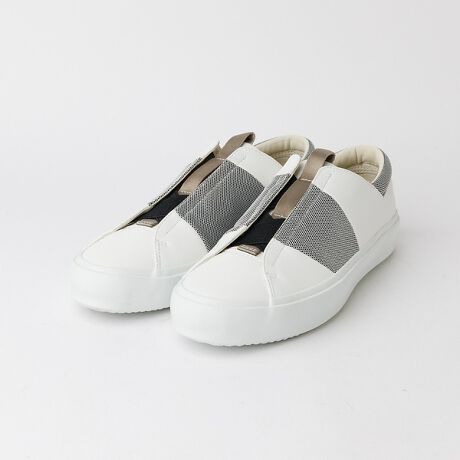 ベーシック過ぎない、異なるなマテリアル(素材)を巧みに切替えた比翼仕立てのデザインスリッポンスニーカー。目を引くナイロンテープや甲ゴム部のクロスさせたエラステックなど、マテリアルコンビネーションを直線的に表現。甲のクロスゴムがフィットし脱ぎ履きがしやすいのもポイント。カジュアルからセットアップ等の綺麗目コーデまで幅広く活躍する一足。