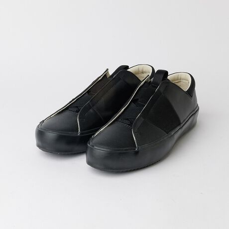ベーシック過ぎない、異なるなマテリアル(素材)を巧みに切替えた比翼仕立てのデザインスリッポンスニーカー。目を引くナイロンテープや甲ゴム部のクロスさせたエラステックなど、マテリアルコンビネーションを直線的に表現。甲のクロスゴムがフィットし脱ぎ履きがしやすいのもポイント。カジュアルからセットアップ等の綺麗目コーデまで幅広く活躍する一足。