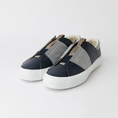 ベーシック過ぎない、異なるなマテリアル(素材)を巧みに切替えた比翼仕立てのデザインスリッポンスニーカー。目を引くナイロンテープや甲ゴム部のクロスさせたエラステックなど、マテリアルコンビネーションを直線的に表現。甲のクロスゴムがフィットし脱ぎ履きがしやすいのもポイント。カジュアルからセットアップ等の綺麗目コーデまで幅広く活躍する一足。