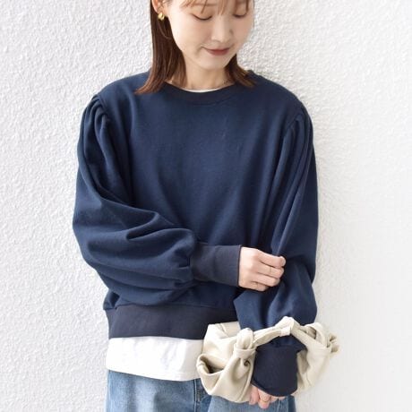 ショルダー部分に贅沢にタックを施したデザイン裏毛トップス。