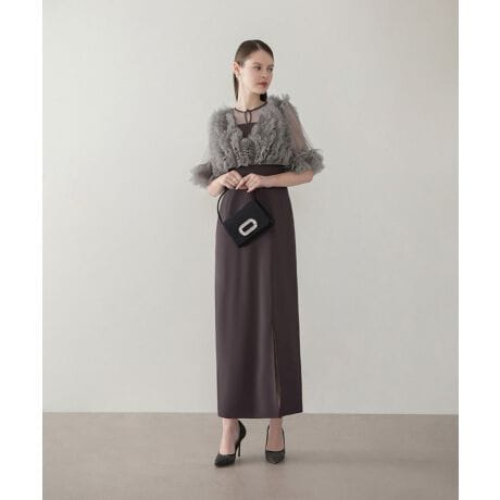 繊細なチュールを贅沢に重ねたビスチェが、顔まわりに品のある華やぎを添えるドレス。