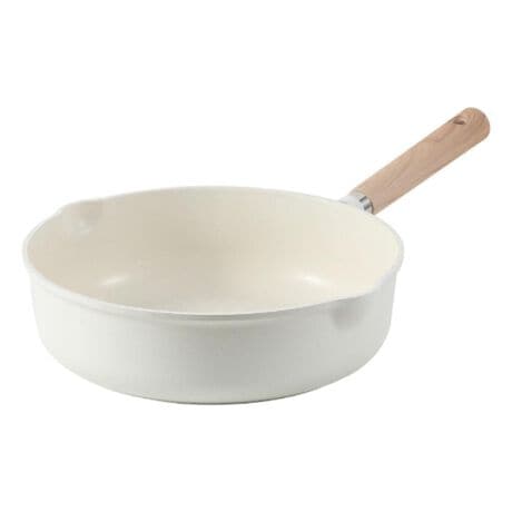 ●おしゃれでかわいい淡色カラー×木製のデザインはどんなキッチンでも合わせやすい。カローテシリーズの深型フライパン。