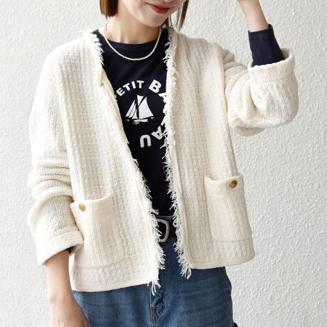 クラシックなツイードの表情をニットで表現した、カーディガンジャケット。