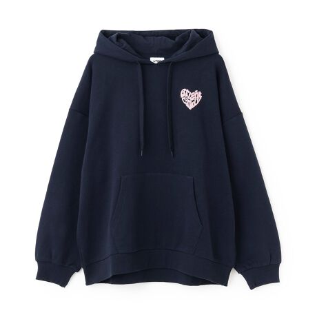 発泡プリントで表現したハートモチーフのロゴデザインが可愛いパーカです。