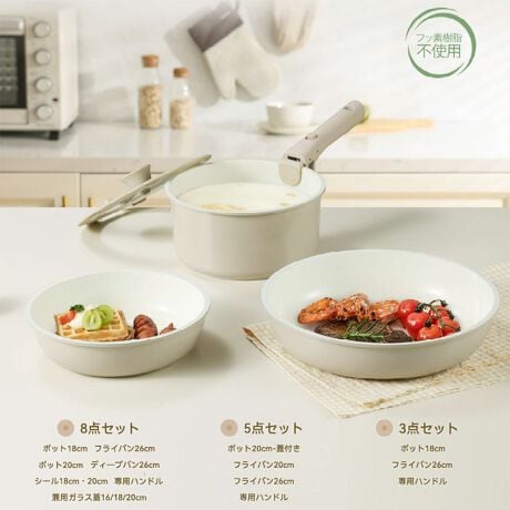 ●セット内容:フライパン26cm、深型フライパン26cm、ポット18cm・20cm、シリコーン縁兼用ガラス蓋(16/18/20cm)、着脱ハンドル、シール蓋18cm・20cm(アイボリー)